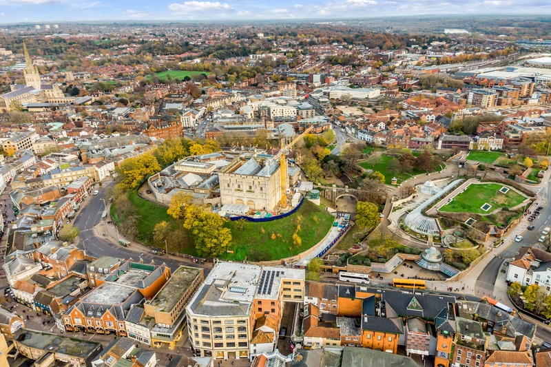 Intorno al mercato si trovano edifici storici come il Guildhall e la chiesa di St. Peter Mancroft, quest’ultima seconda solo alla cattedrale per dimensioni.